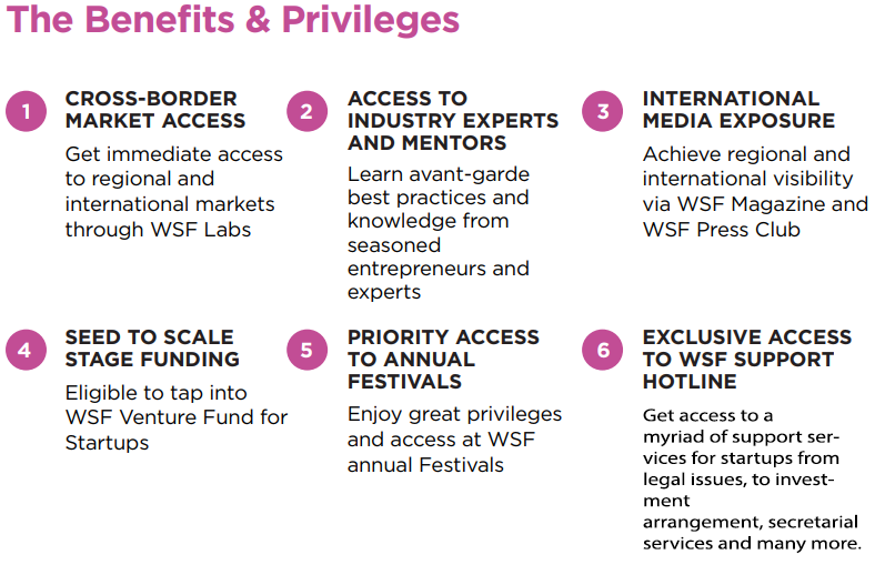 WSF works with startup ecosystems around the world to establish a truly cross-border collaborative support structure. WSF invites startups around the world to join us as Startup Members to enjoy priority access to WSF incubator and accelerator programmes, exclusive access to WSF Support Center, the networking Festivals and our international media channels.