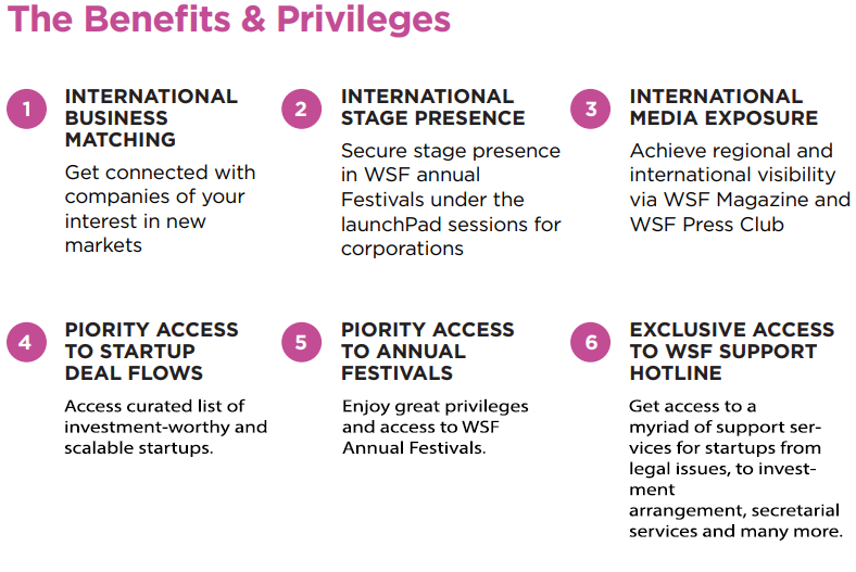 There is powerful synergy from corporate-startup partnerships. WSF is looking for corporations that are supportive of youth entrepreneurship and are willing to support the startup ecosystem by providing investments and business collaboration with startups. Startups provide cost eciency and new technology for corporations to tap into.